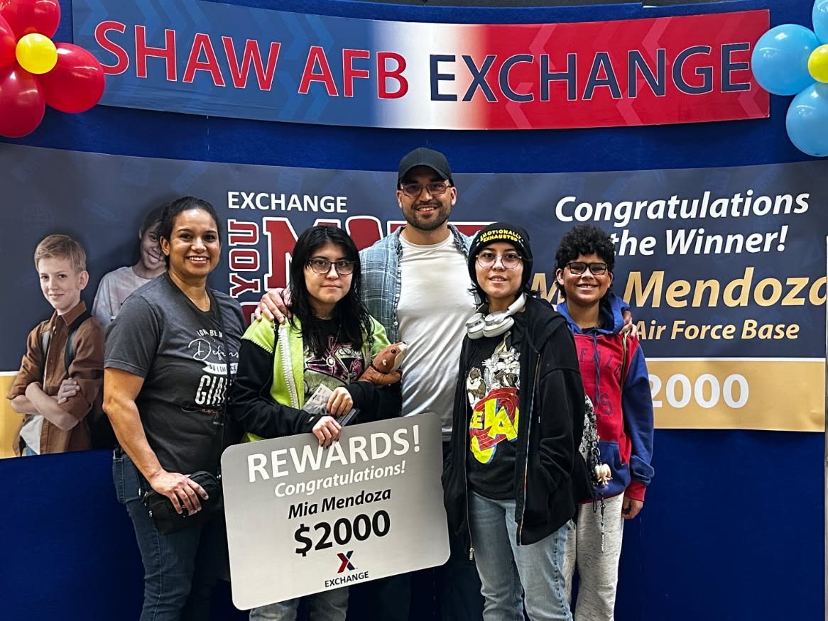 Fort Belvoir Upper School rising third grader Bronsyn Dungey accepts his You Made the Grade Prize at the Fort Belvoir Exchange, accompanied by his mother, Megan Dungey, and his sisters. At right is Fort Belvoir Store Manager Nanami Taniguchi.